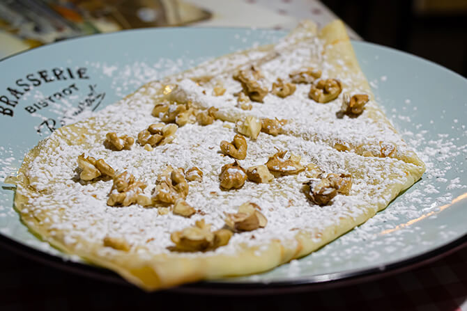 En cuanto a los crepes dulces, tienen con manjar, nutella, miel de campo, mermelada casera o azúcar limón por $2.300. Nosotros pedimos este último y agregamos nueces por $700 (también puedes agregar plátano, super 8 o negrita). El crepe estaba perfecto en sabor, consistencia y dulzura. Muy bueno.